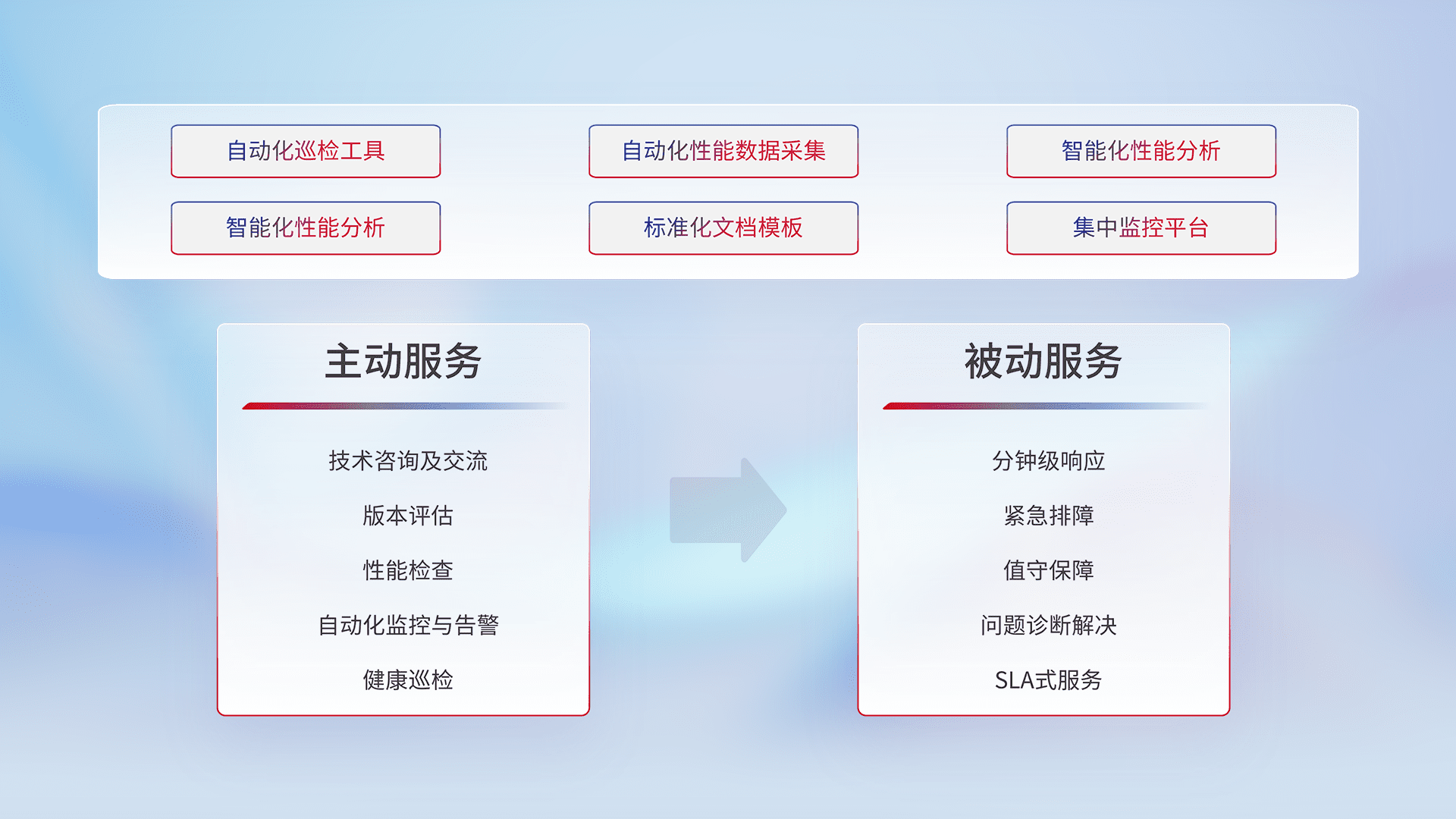 智能化工具和标准化文档,,,保障服务质量,,,,提供主动服务(包含技术咨询、、版本评估、、、性能检查、、、自动化监控与告警、、、健康巡检)和被动服务包含(分钟级响应、、、、紧急排障、、值守保障、、、问题诊断解决、、SLA服务)。。。